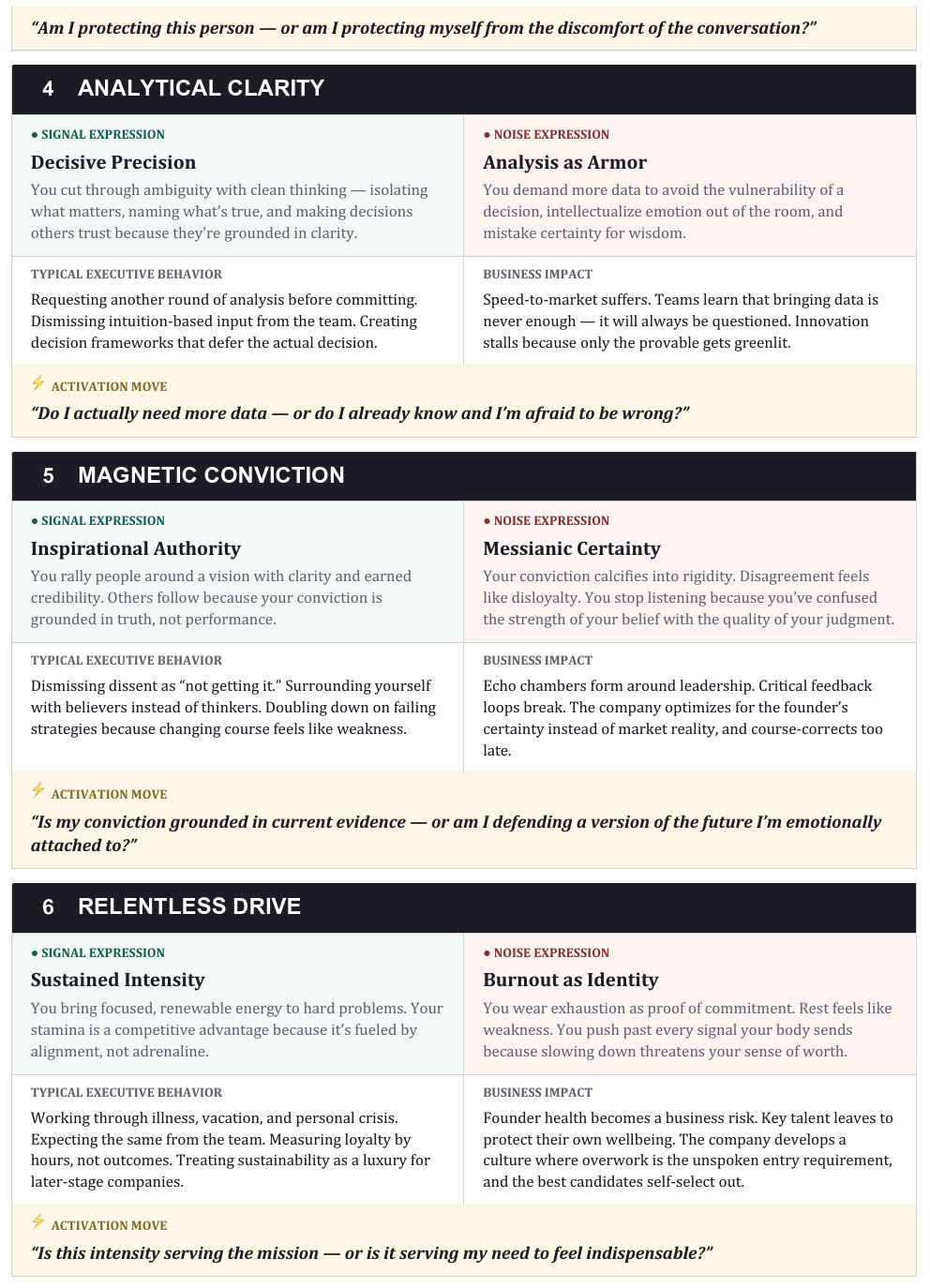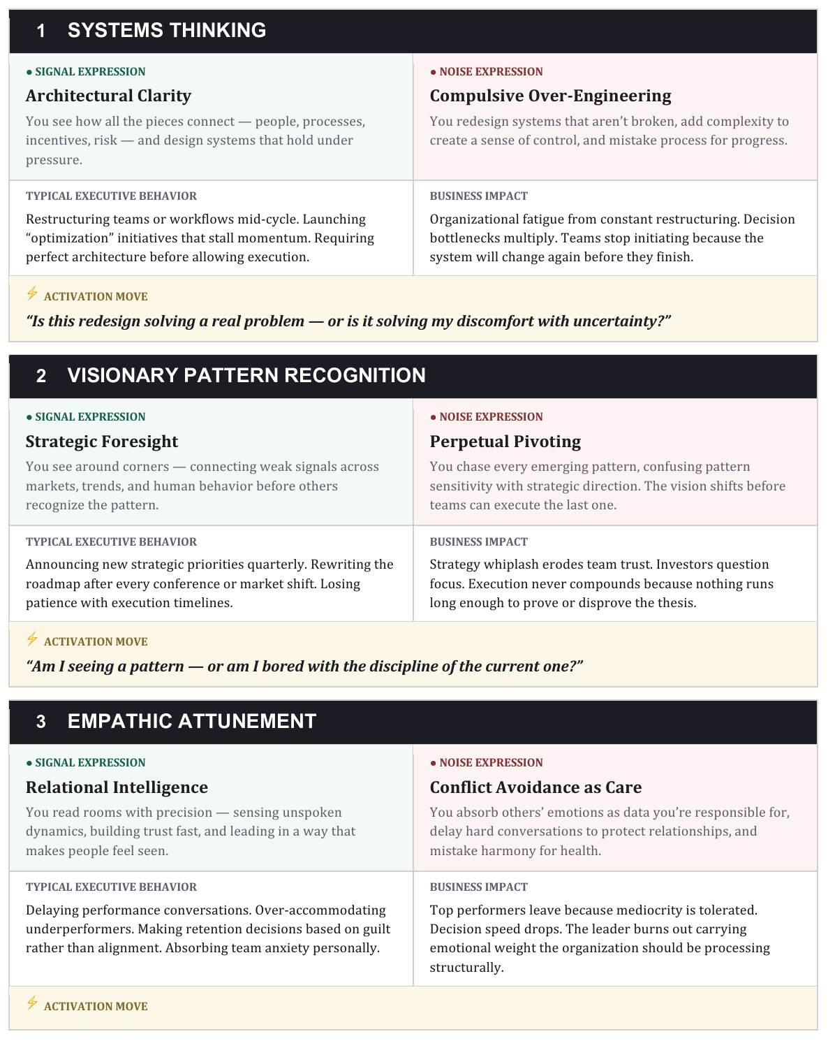 This isn't weakness. It's physics. Every attribute, under enough pressure, has a noise expression. And in highstakes leadership, the pressure is constant. Here are a few examples of natural attributes that commonly show up in leaders of growth-stage companies. For each, you’ll see the “Signal” expression, the “Noise” expression, how it tends to show up in executive behavior, the business impact, and a one-line activation move to go from Noise to Signal.